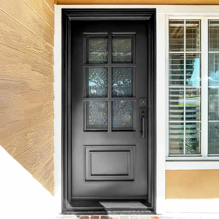 | ESSEX RH WROUGHT IRON Style 37 X 81 RIGHT HAND INSWING FLAT BLACK Color RAIN Glass STEEL Material PULL HANDLE #006 SQUARE DEADBOLT 8469 - SINGLE CYLINDER (FLAT BLACK (US19)) SINGLE SQUARE TOP Modern, Contemporary, Farmhouse, Craftsman, Cape Cod Style solid, Residential, Commercial (Pull Handles and Locks are price separately) | |