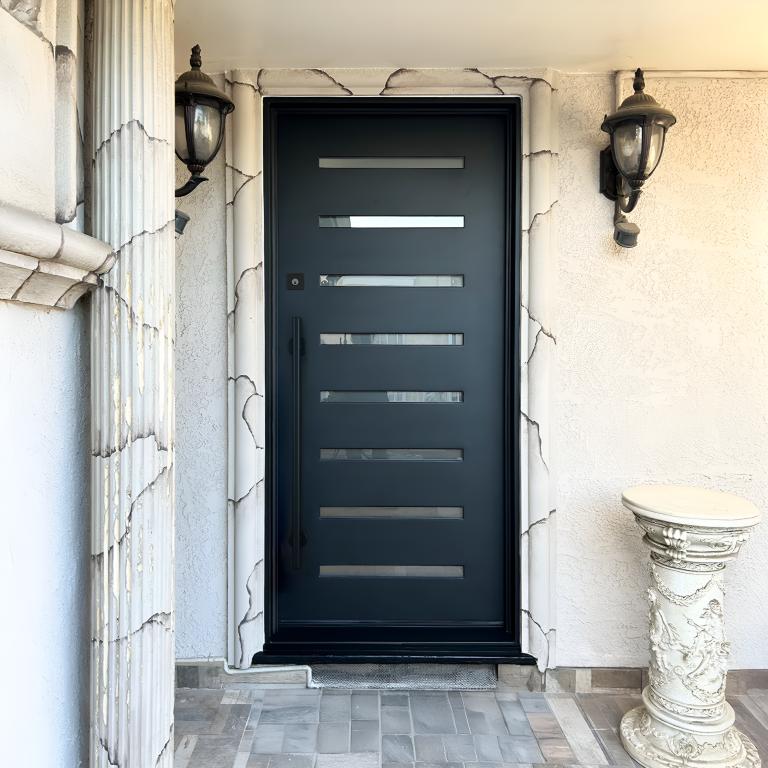 | THE BEAST 2 RH WROUGHT IRON Style 42 X 81 RIGHT HAND INSWING FLAT BLACK Color SANDBLAST Glass STEEL Material PULL HANDLE #037 VITO - D107 - BL - S - SINGLE SQUARE TOP Modern, Contemporary, Art Deco Style solid, Residential, Commercial (Pull Handles and Locks are price separately) | |