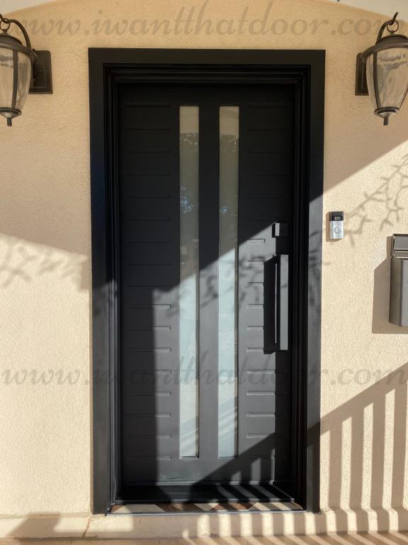 | ALPHEUS RH Wrought Iron Door 37 X 81 RIGHT HAND INSWING FLAT BLACK Color SANDBLAST Glass STEEL Material PULL HANDLE #006 SQUARE DEADBOLT SINGLE SQUARE TOP Modern, Contemporary, Art Deco Style solid, Residential, Commercial (Pull Handles and Locks are price separately) | |
