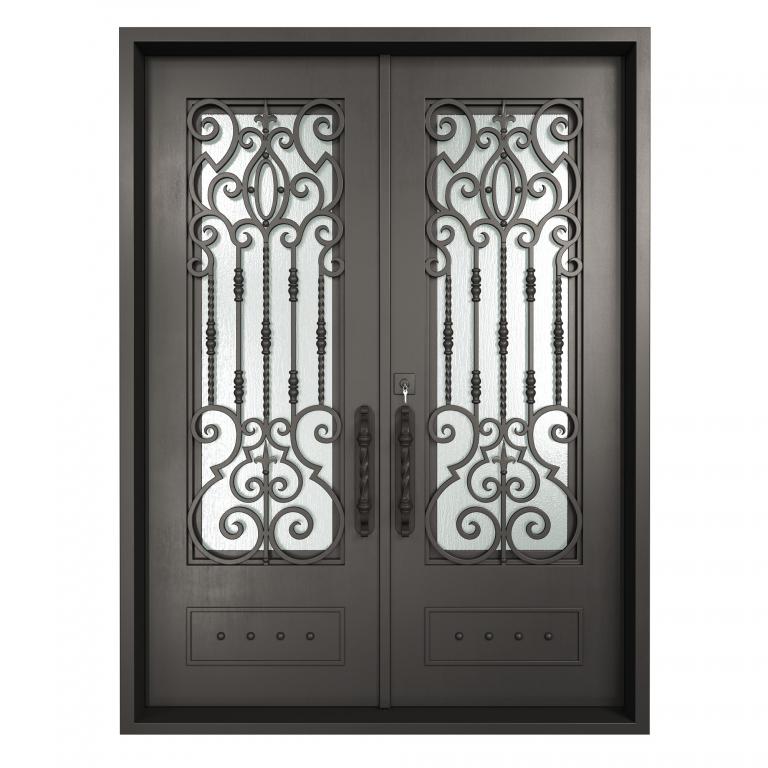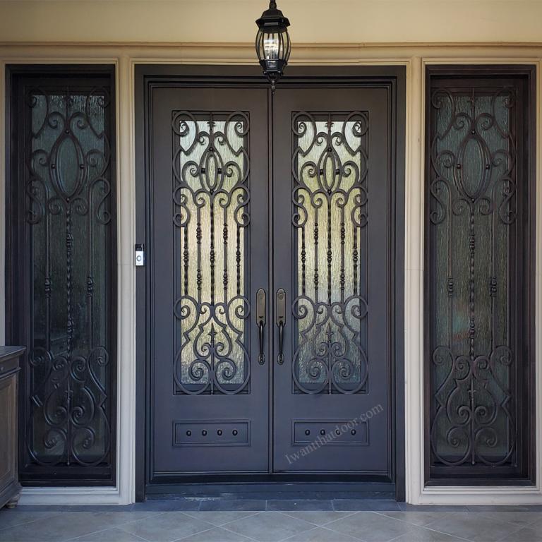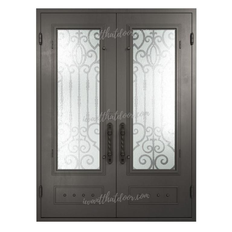 | ANGELINO RH Wrought Iron Door 72 X 96 RIGHT HAND INSWING MEDIUM COPPER Color RAIN Glass STEEL Material PULL HANDLE #004 SQUARE DEADBOLT DOUBLE SQUARE TOP Mediterranean, Spanish, Italianate Style Residential, Commercial (Pull Handles and Locks are price separately) | |