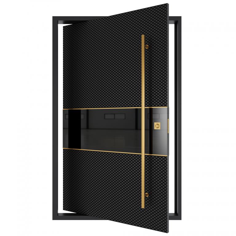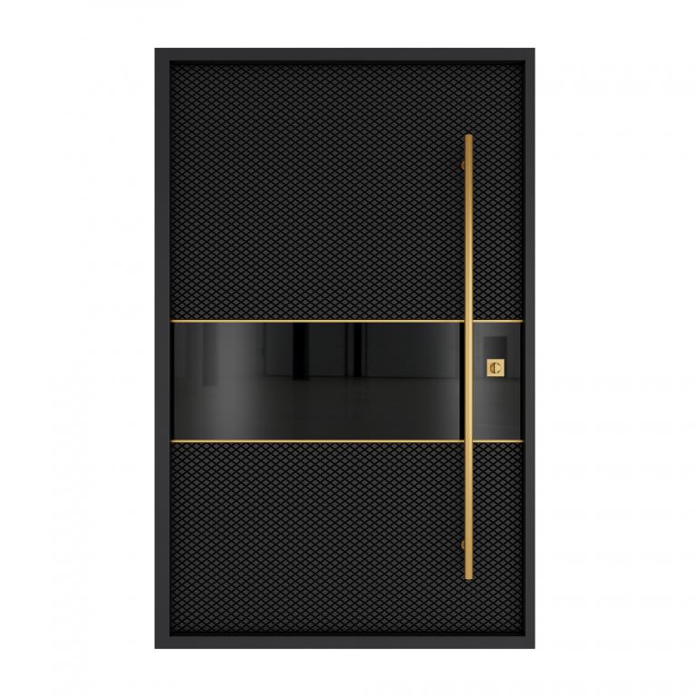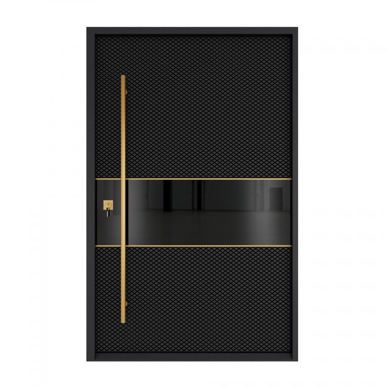 | TUNDRA PIVOT RH Metal Pivot Door 61 X 96 RIGHT HAND INSWING FLAT BLACK Color ALUMINUM Material PULL HANDLE #058 BRUSHED GOLD ROUND 70" SQUARE DEADBOLT 8469 - SINGLE CYLINDER (SATIN BRASS (US4)) SINGLE SQUARE TOP Modern, Contemporary Style solid, Residential, Commercial (Pull Handles and Locks are price separately) | |