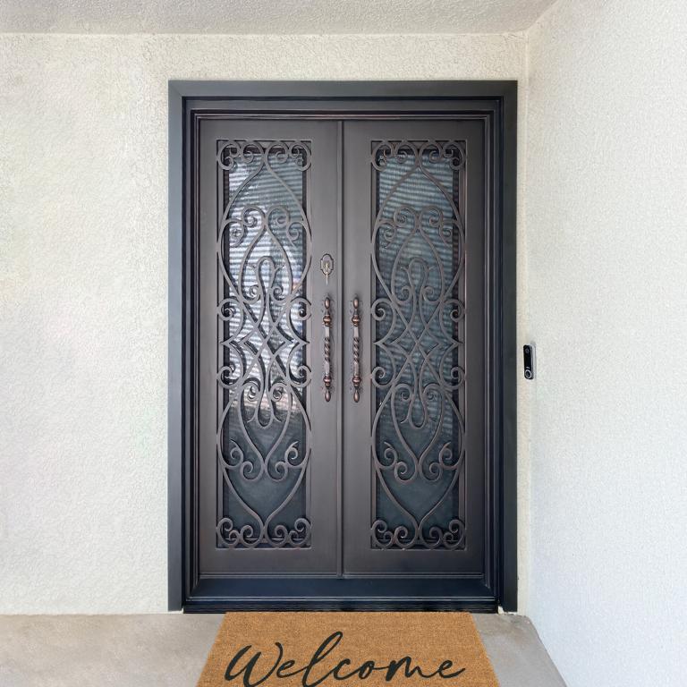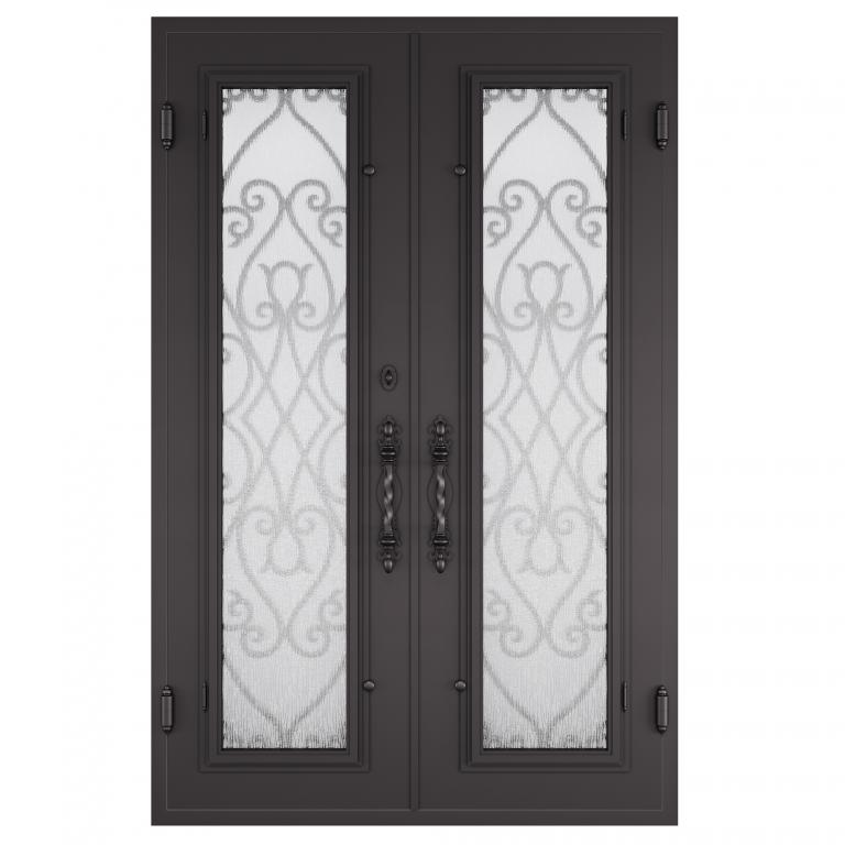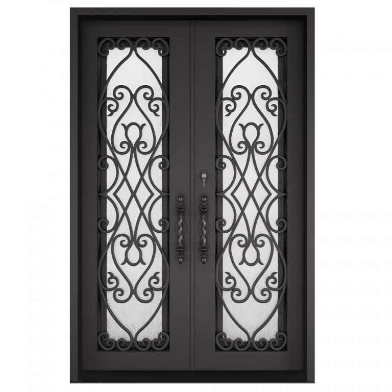 | FLORENCE RH WROUGHT IRON Style 61 X 96 RIGHT HAND INSWING DARK COPPER Color RAIN Glass STEEL Material PULL HANDLE #019 SIROCCO - D109 - ORB - SINGLE CYLINDER DOUBLE SQUARE TOP Mediterranean, Spanish, Italianate Style Residential, Commercial (Pull Handles and Locks are price separately) | |