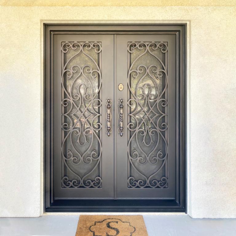 | FLORENCE RH WROUGHT IRON Style 61 X 81 RIGHT HAND INSWING DARK COPPER Color RAIN Glass STEEL Material PULL HANDLE #019 SIROCCO - D109 - ORB - SINGLE CYLINDER DOUBLE SQUARE TOP Mediterranean, Spanish, Italianate Style Residential, Commercial (Pull Handles and Locks are price separately) | |