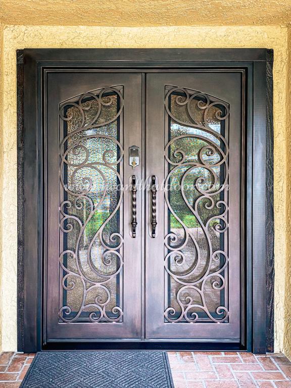 | TUSCANY 7TH THERMAL BREAK RH Wrought Iron Door 61 X 81 RIGHT HAND INSWING MEDIUM COPPER Color RAIN Glass STEEL Material PULL HANDLE #005 DOUBLE SQUARE TOP Mediterranean, Spanish, Italianate Style thermalBreak, Residential, Commercial (Pull Handles and Locks are price separately) | |