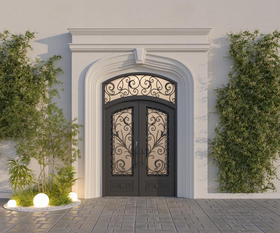 | RENAISSANCE WITH ATTACHED TRANSOM LH WROUGHT IRON Style 72 X 120 LEFT HAND INSWING DARK COPPER Color RAIN Glass STEEL Material PULL HANDLE #019 VITO - D107 - BL - S - DOUBLE EYEBROW TOP Mediterranean, Spanish, Italianate Style Residential, Commercial (Pull Handles and Locks are price separately) | |