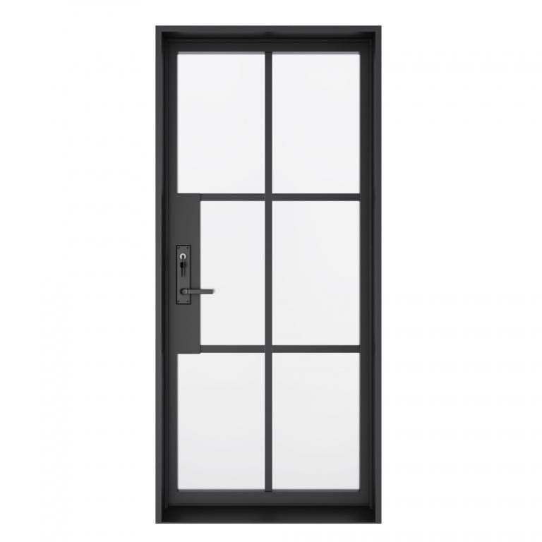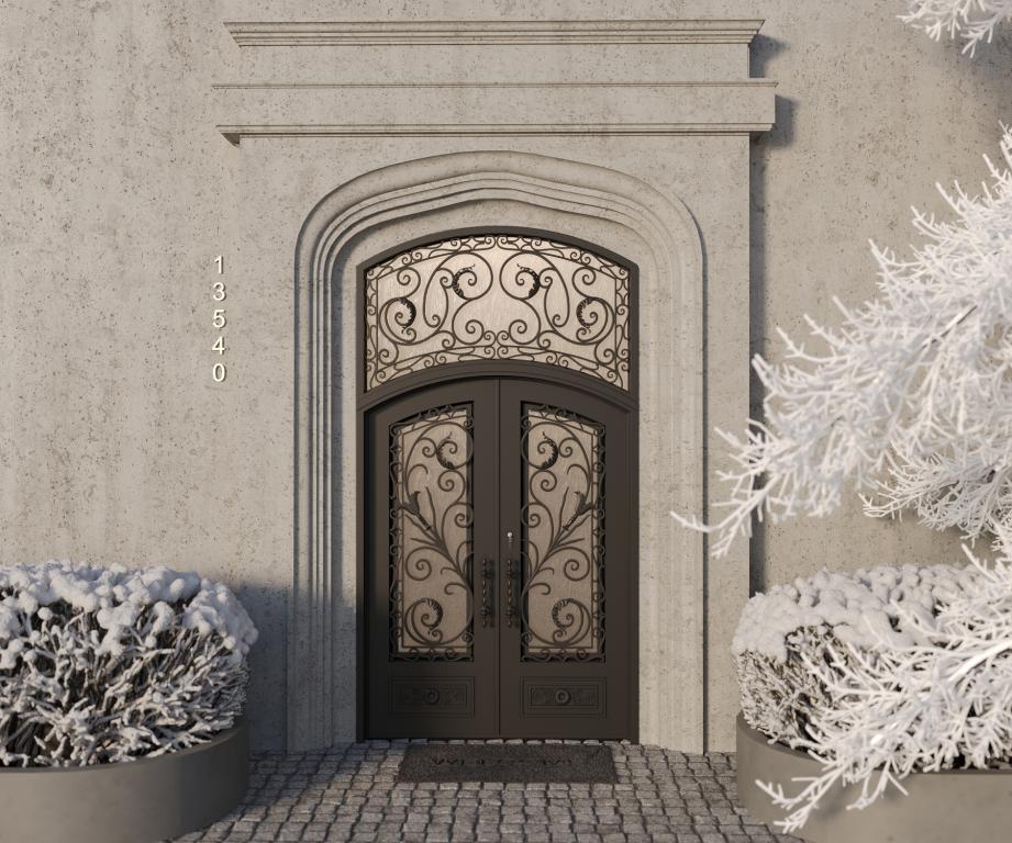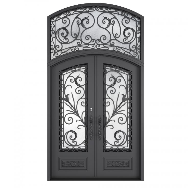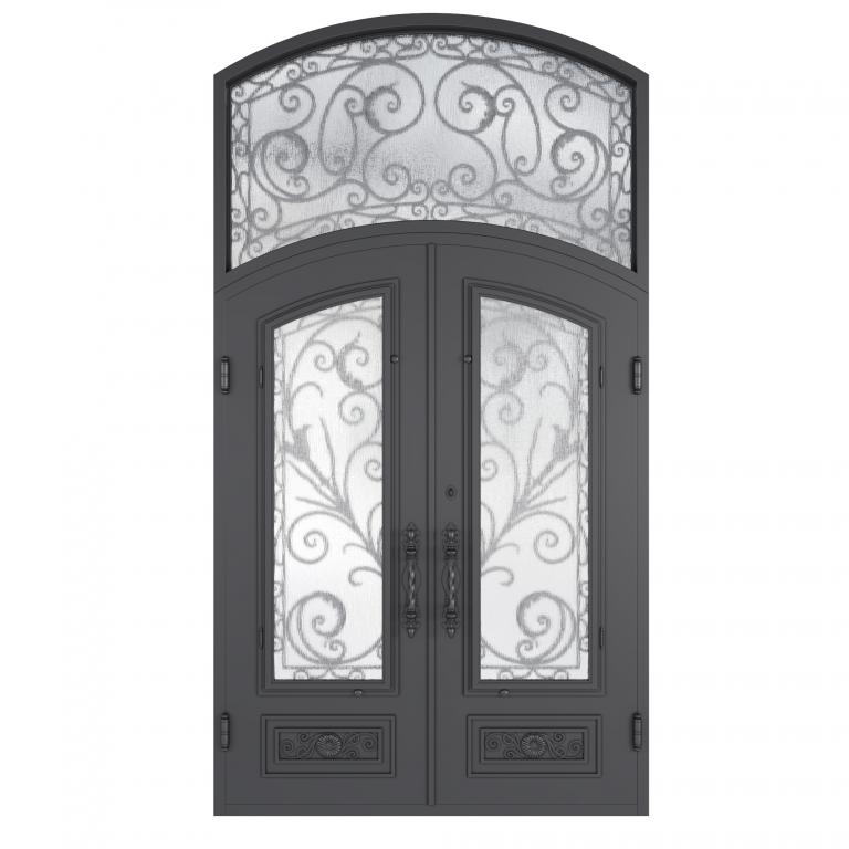 | RENAISSANCE WITH ATTACHED TRANSOM LH WROUGHT IRON Style 72 X 132 LEFT HAND INSWING DARK COPPER Color RAIN Glass STEEL Material PULL HANDLE #019 VITO - D107 - BL - S - DOUBLE EYEBROW TOP Mediterranean, Spanish, Italianate Style Residential, Commercial (Pull Handles and Locks are price separately) | |