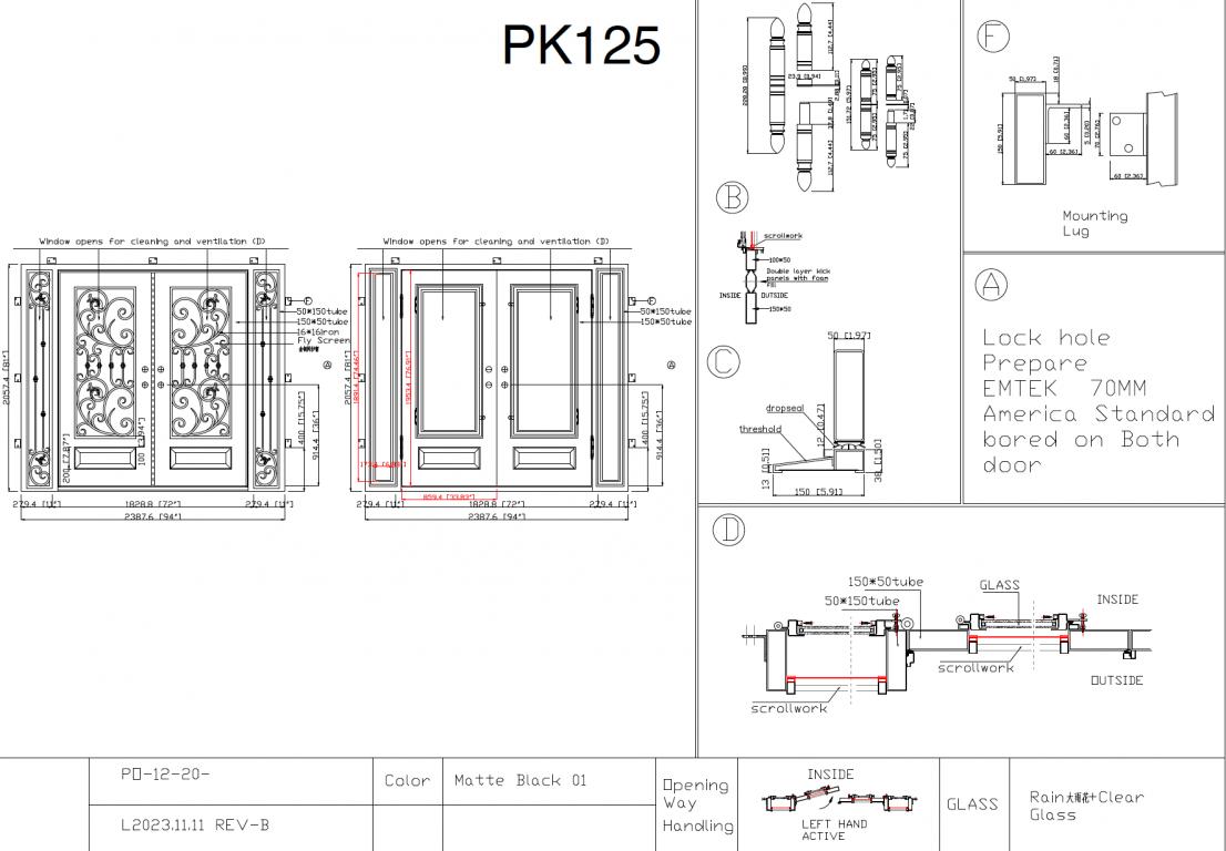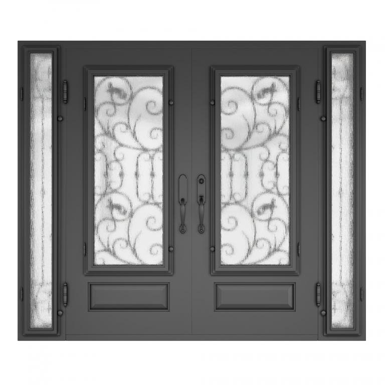 | CUSTOM #1038 PK125 WROUGHT IRON Style 94 X 81 LEFT HAND INSWING MATTE BLACK (01) Color RAIN + CLEAR Glass SQUARE TOP Mediterranean, Spanish, Italianate Style wScreen | |