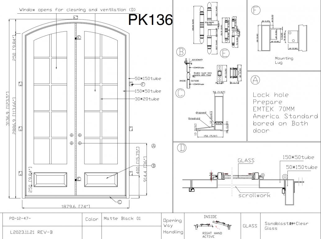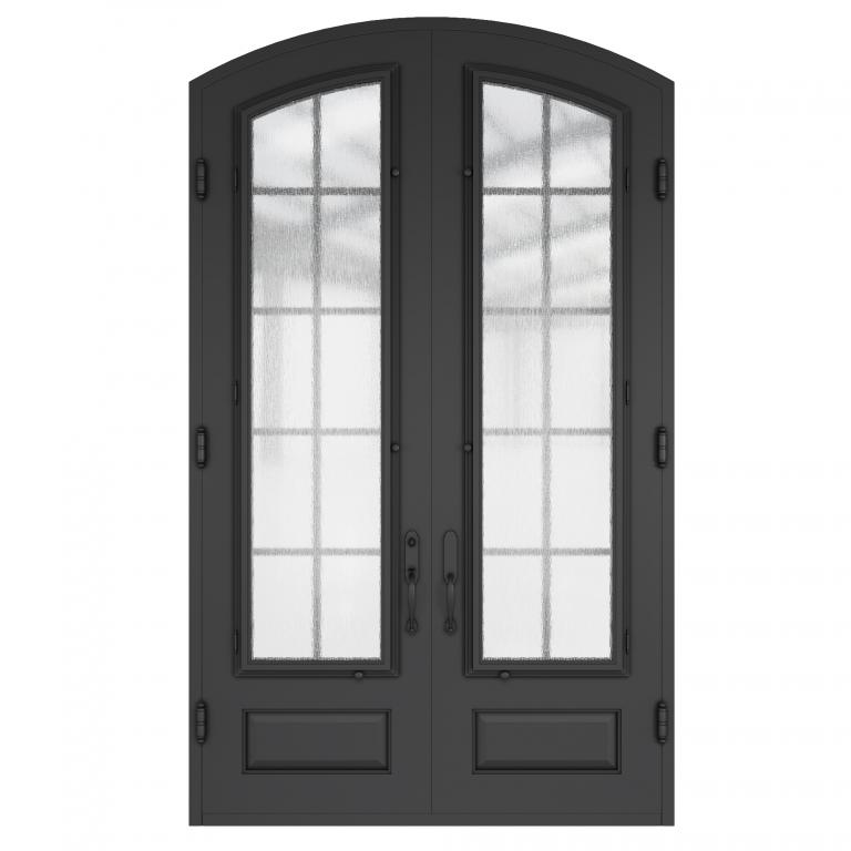| CUSTOM #1044 PK136 WROUGHT IRON Style 74 X 124 RIGHT HAND INSWING MATTE BLACK (01) Color SANDBLAST + CLEAR Glass ROCCO - 9601-ORB- ET - ACTIVE EYEBROW TOP Modern, Contemporary Style (Pull Handles and Locks are price separately) | |
