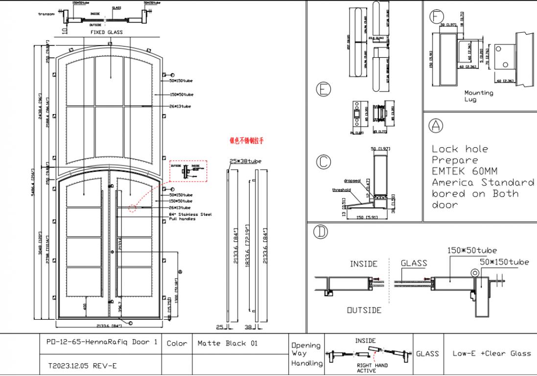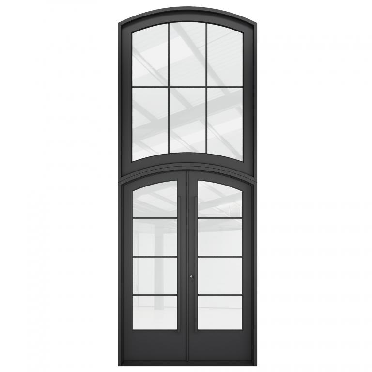 | CUSTOM #1050 PK144 WROUGHT IRON Style 84 X 216 RIGHT HAND INSWING MATTE BLACK (01) Color LOW-E CLEAR Glass SQUARE DEADBOLT EYEBROW TOP (Pull Handles and Locks are price separately) | |