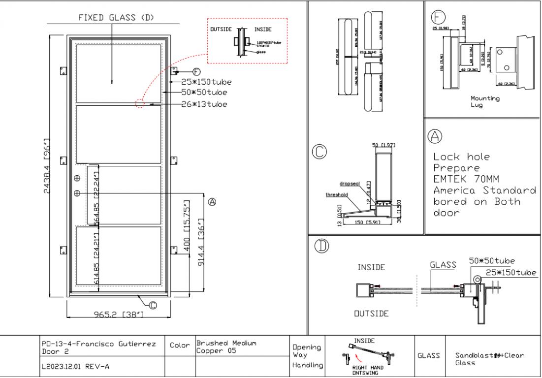 | CUSTOM #1058 PK153 WROUGHT IRON Style 38 X 96 RIGHT HAND INSWING MEDIUM BRUSHED COPPER (05) Color SANDBLAST + CLEAR Glass TANGO - 305A10 - BL - ET - ACTIVE SQUARE TOP Modern, Contemporary Style (Pull Handles and Locks are price separately) | |