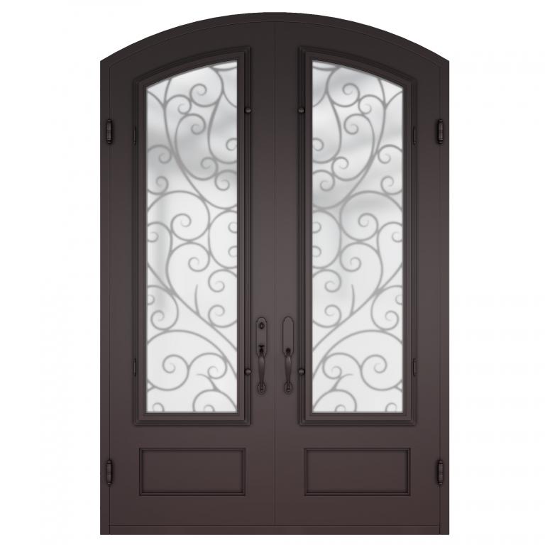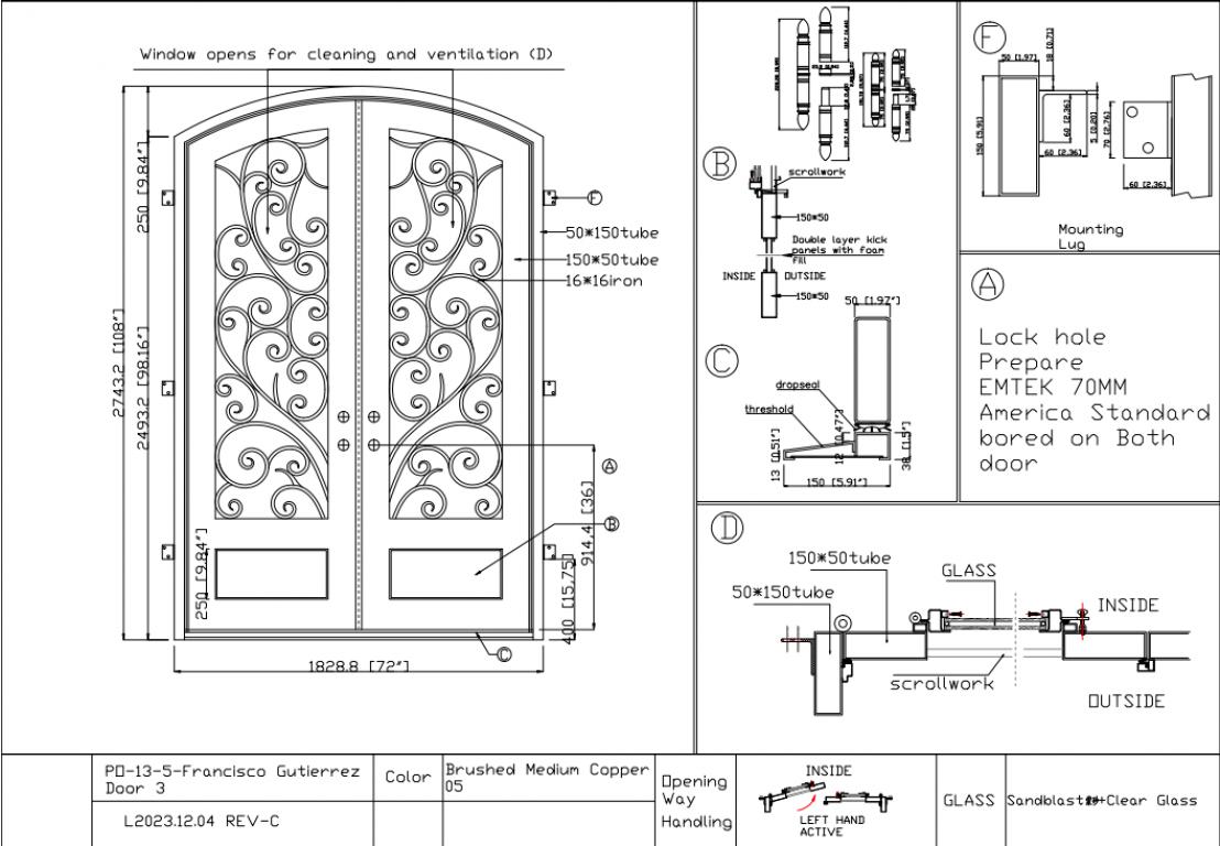 | CUSTOM #1059 PK154 WROUGHT IRON Style 72 X 108 LEFT HAND INSWING MEDIUM BRUSHED COPPER (05) Color SANDBLAST + CLEAR Glass ROCCO - 9601-ORB- ET - ACTIVE EYEBROW TOP (Pull Handles and Locks are price separately) | |