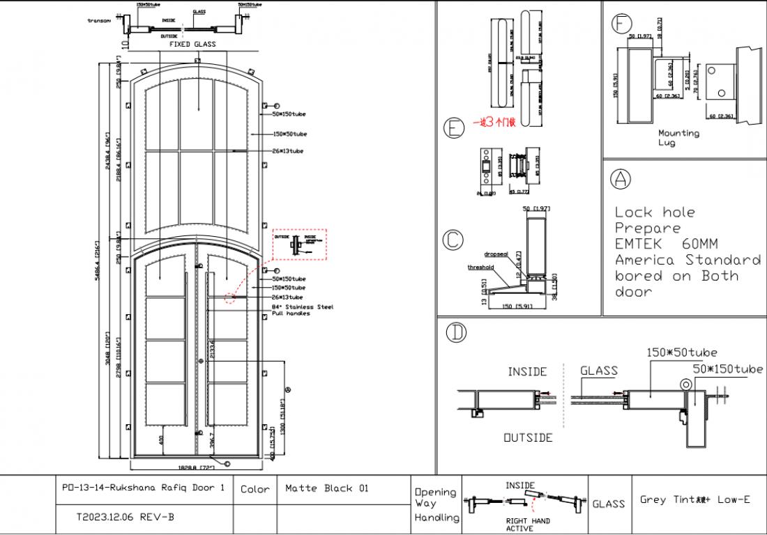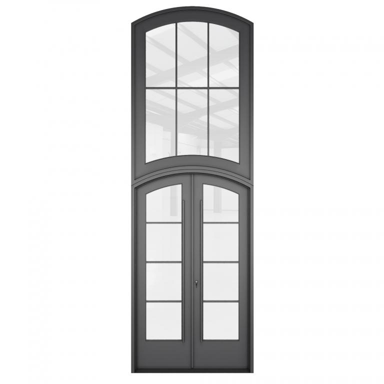 | CUSTOM #1064 PK159 WROUGHT IRON Style 72 X 216 RIGHT HAND INSWING MATTE BLACK (01) Color GREY TINT + LOW-E Glass VITO - D107 - BL - S - EYEBROW TOP (Pull Handles and Locks are price separately) | |