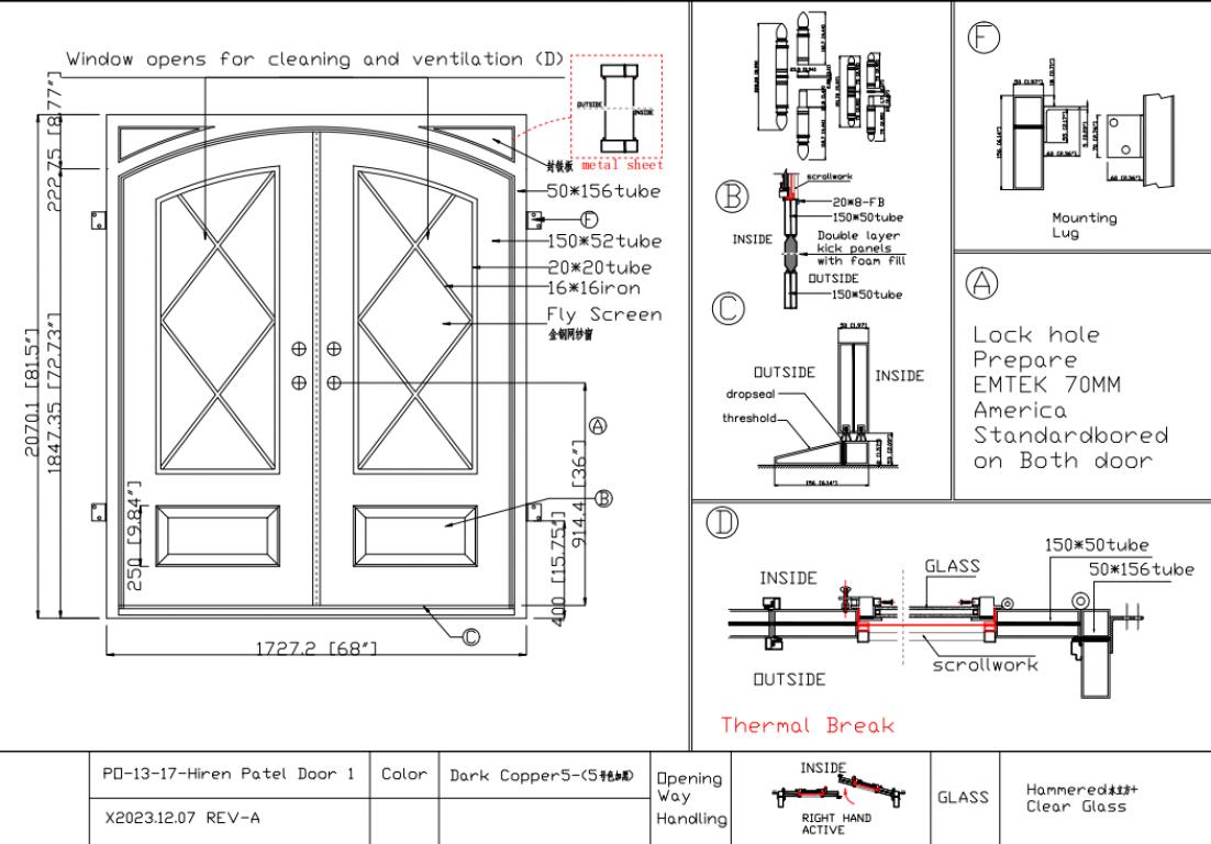 | CUSTOM #1065 PK160 WROUGHT IRON Style 68 X 82 RIGHT HAND INSWING DARK COPPER Color HAMMERED + CLEAR Glass ROCCO - 9601-ORB- ET - ACTIVE SQUARE TOP wScreen, Thermal Break (Pull Handles and Locks are price separately) | |