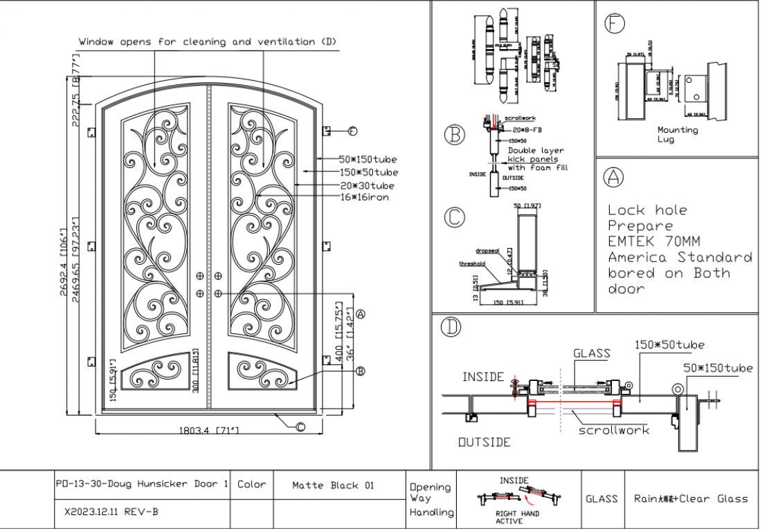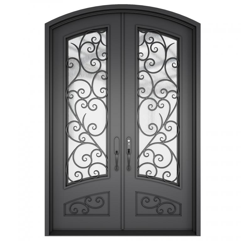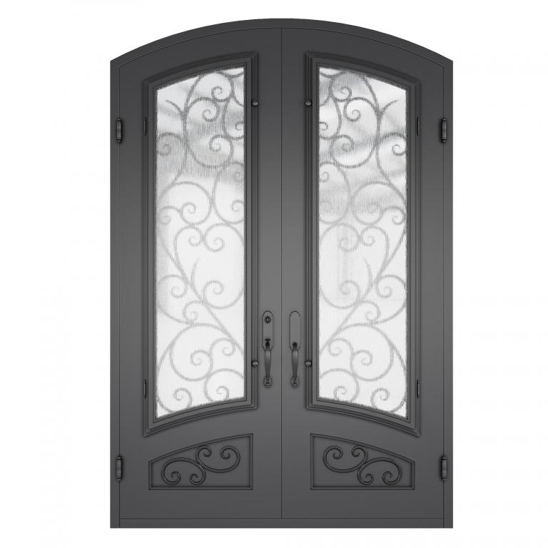 | CUSTOM #1069 PK166 WROUGHT IRON Style 71 X 106 RIGHT HAND INSWING MATTE BLACK (01) Color RAIN + CLEAR Glass ROCCO - 9601-ORB- ET - ACTIVE EYEBROW TOP (Pull Handles and Locks are price separately) | |