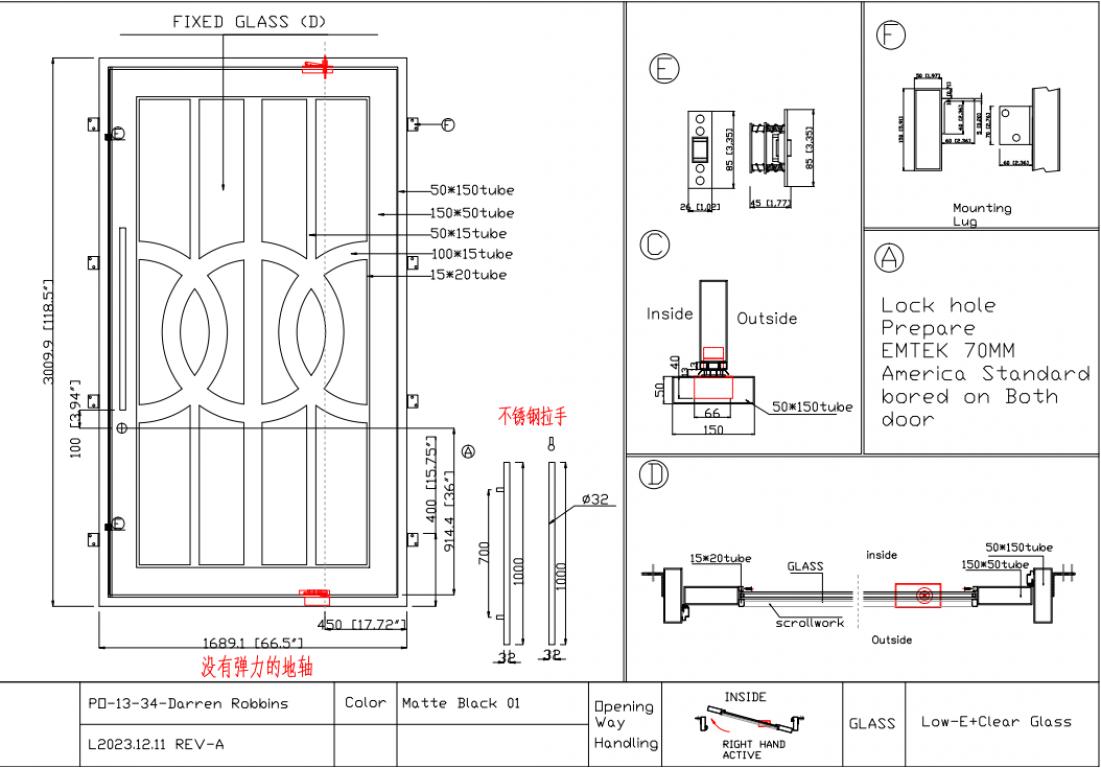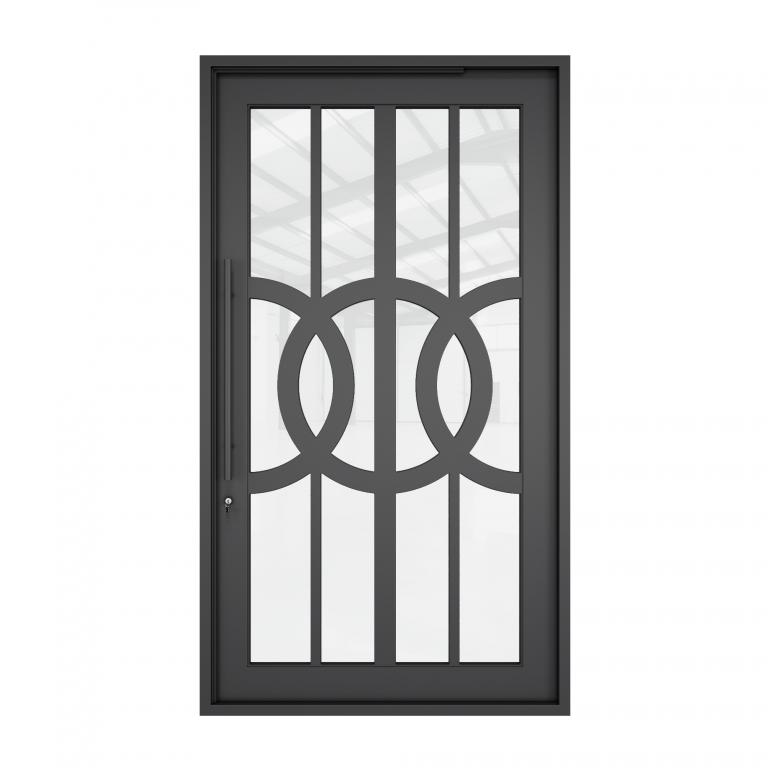 | CUSTOM #1071 PK168 WROUGHT IRON Style 67 X 119 RIGHT HAND INSWING MATTE BLACK (01) Color LOW-E CLEAR Glass PULL HANDLE #006 VITO - D107 - BL - S - SQUARE TOP (Pull Handles and Locks are price separately) | |