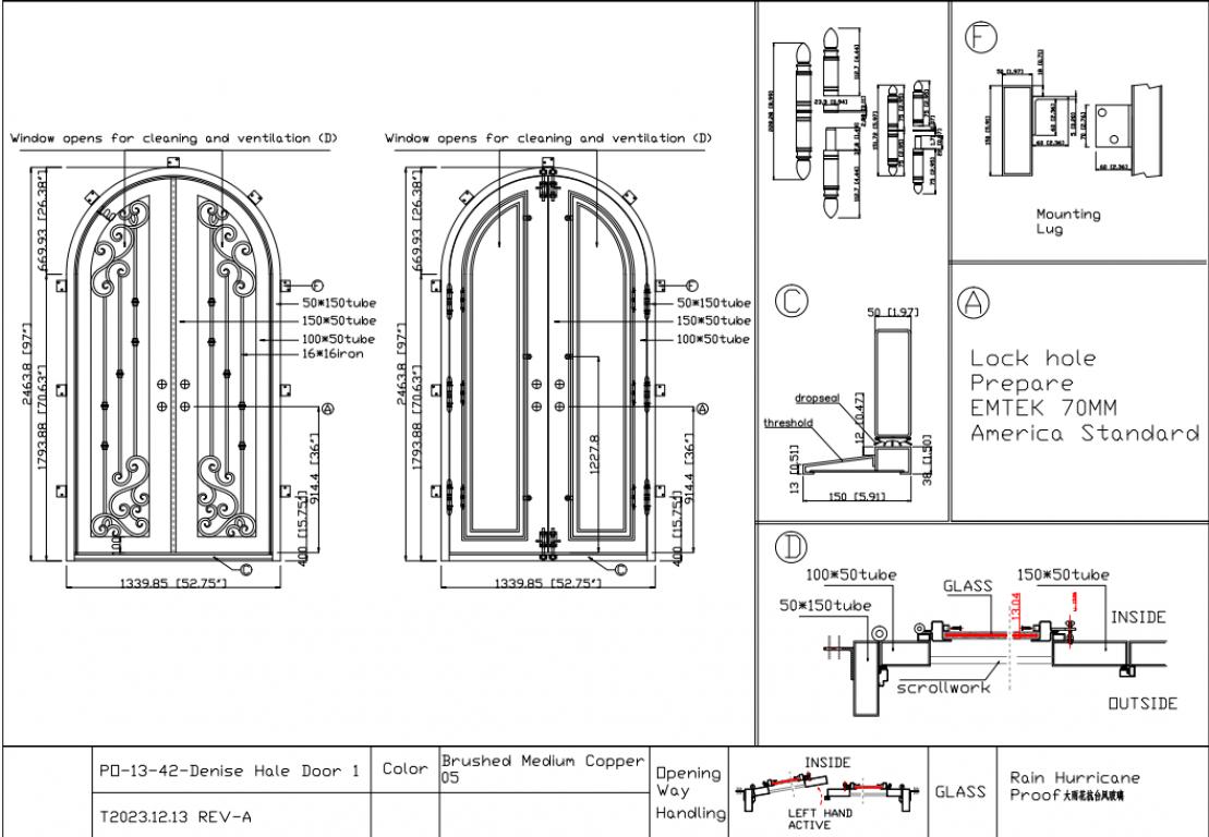 | CUSTOM #1073 PK170 WROUGHT IRON Style 53 X 97 LEFT HAND INSWING MEDIUM BRUSHED COPPER (05) Color RAIN HURRICANE PROOF Glass ROCCO - 9601-ORB- ET - ACTIVE RADIUS TOP (Pull Handles and Locks are price separately) | |