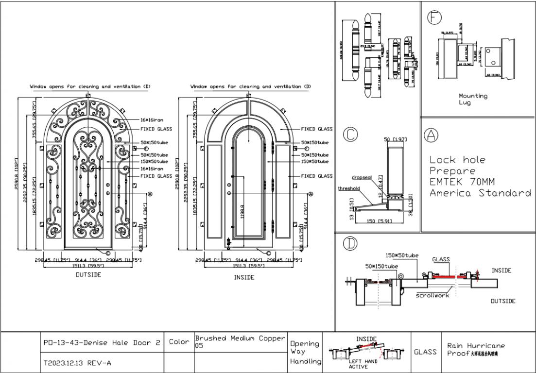 | CUSTOM #1074 PK171 WROUGHT IRON Style 60 X 102 LEFT HAND INSWING MEDIUM BRUSHED COPPER (05) Color RAIN HURRICANE PROOF Glass ROCCO - 9601-ORB- ET - ACTIVE RADIUS TOP HurricaneProof (Pull Handles and Locks are price separately) | |