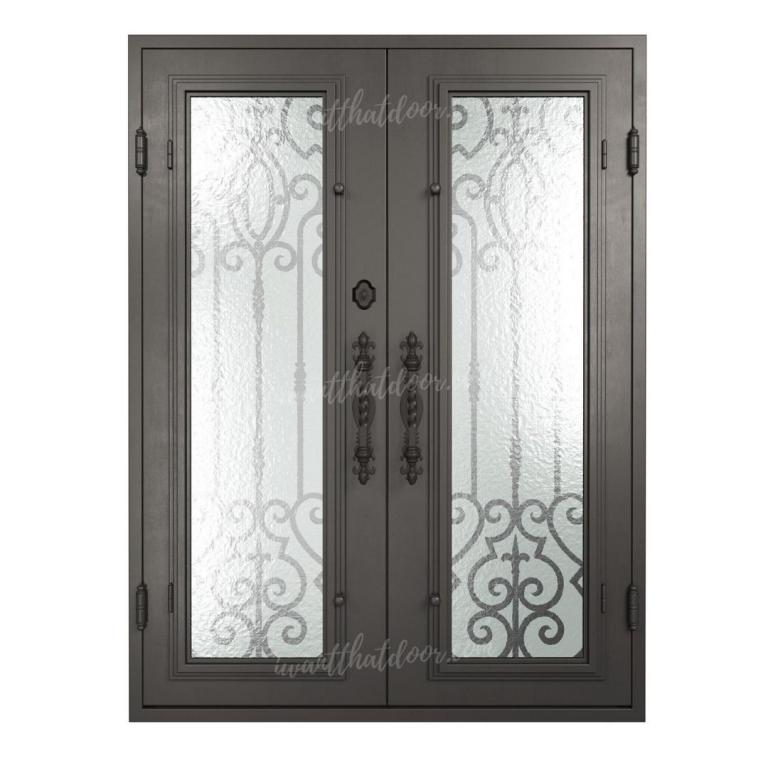 | ANGELINO 2 RH Wrought Iron Door 61 X 81 RIGHT HAND INSWING MEDIUM COPPER Color FLEMISH Glass STEEL Material PULL HANDLE #019 SQUARE DEADBOLT DOUBLE SQUARE TOP Mediterranean, Spanish, Italianate Style Residential, Commercial (Pull Handles and Locks are price separately) | |