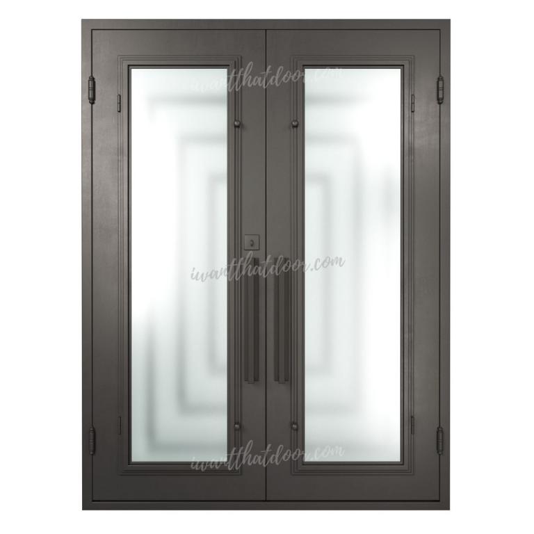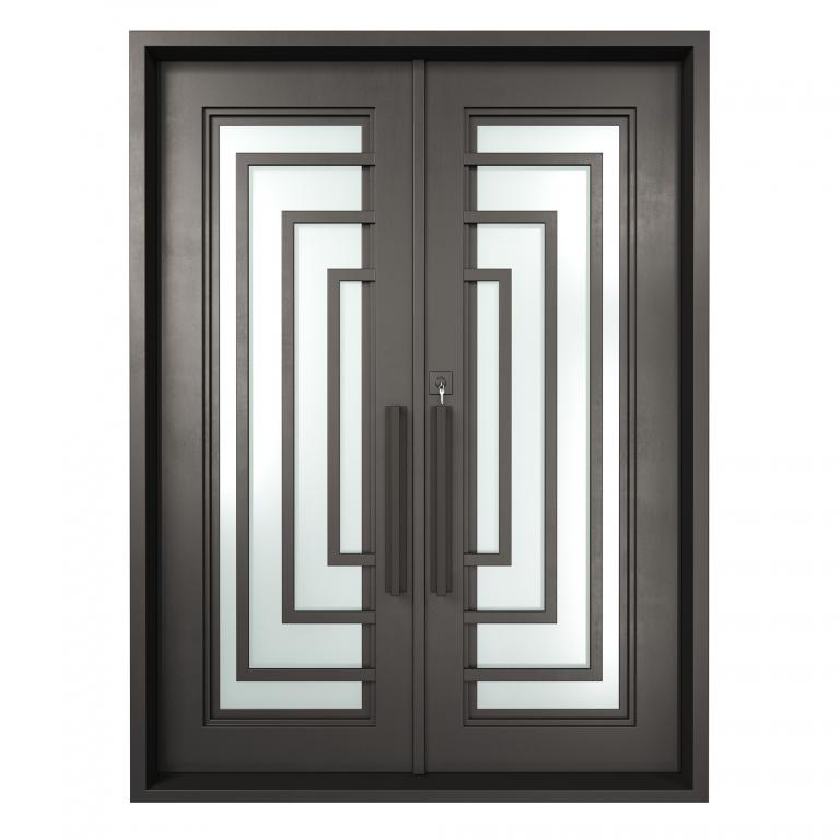 | REFLECTION RH Wrought Iron Door 72 X 96 RIGHT HAND INSWING FLAT BLACK Color SANDBLAST Glass STEEL Material PULL HANDLE #006 SQUARE DEADBOLT DOUBLE SQUARE TOP Modern, Contemporary Style Residential, Commercial (Pull Handles and Locks are price separately) | |