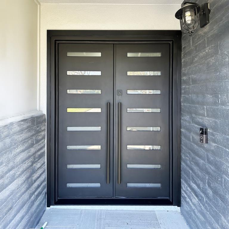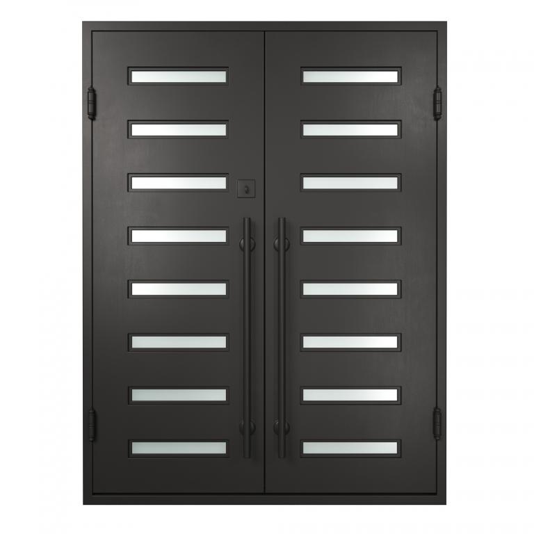 | THE BEAST 2 RH WROUGHT IRON Style 61 X 81 RIGHT HAND INSWING FLAT BLACK Color SANDBLAST Glass STEEL Material PULL HANDLE #038 VITO - D107 - BL - S - DOUBLE SQUARE TOP Modern, Contemporary, Art Deco Style Residential, Commercial (Pull Handles and Locks are price separately) | |