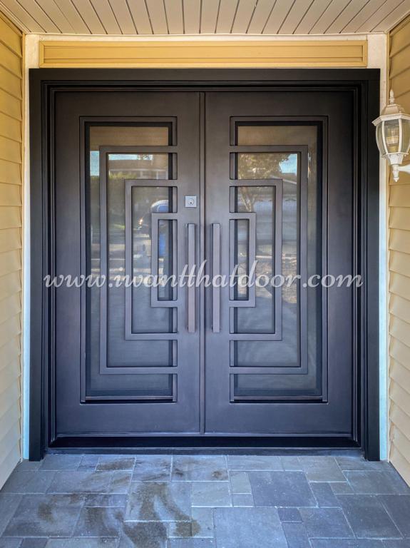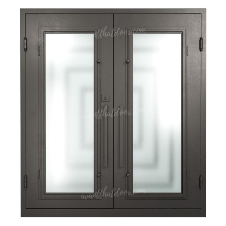 | REFLECTION RH Wrought Iron Door 72 X 81 RIGHT HAND INSWING FLAT BLACK Color SANDBLAST Glass STEEL Material PULL HANDLE #006 SQUARE DEADBOLT DOUBLE SQUARE TOP Modern Style Residential, Commercial (Pull Handles and Locks are price separately) | |