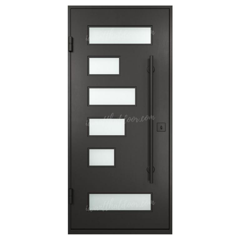 | PACO RH Wrought Iron Door 37 X 81 RIGHT HAND INSWING FLAT BLACK Color SANDBLAST Glass STEEL Material PULL HANDLE #038 SQUARE DEADBOLT SINGLE SQUARE TOP Modern, Contemporary Style solid, Residential, Commercial (Pull Handles and Locks are price separately) | |