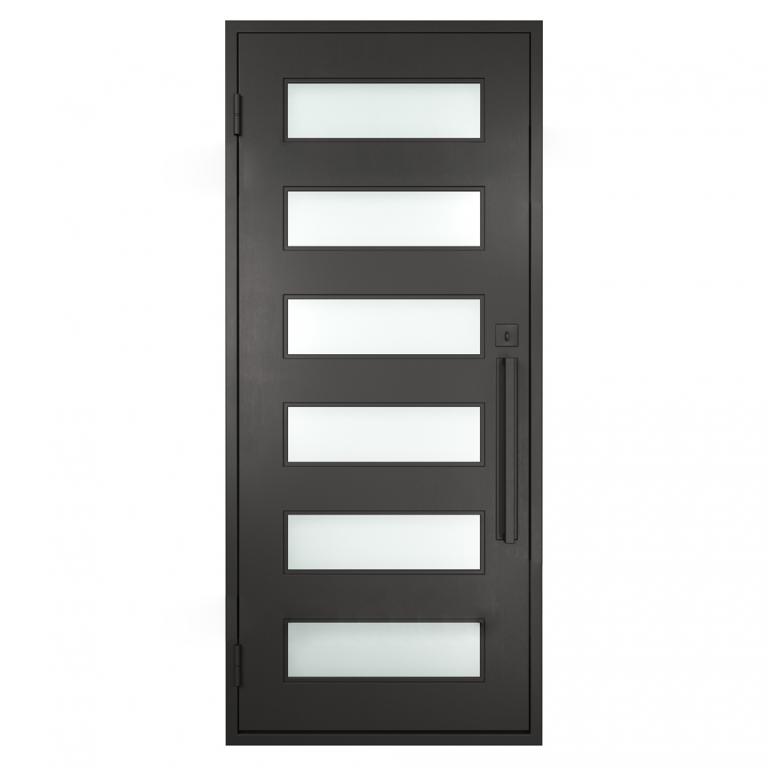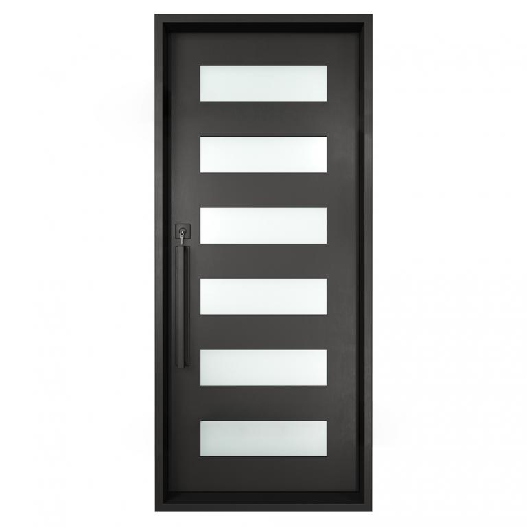 | THE BEAST RH Wrought Iron Door 42 X 96 RIGHT HAND INSWING FLAT BLACK Color SANDBLAST Glass STEEL Material PULL HANDLE #006 SQUARE DEADBOLT SINGLE SQUARE TOP Modern, Contemporary, Art Deco Style solid, Residential, Commercial (Pull Handles and Locks are price separately) | |