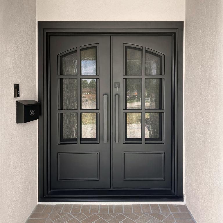 | ESSEX RH WROUGHT IRON Style 72 X 81 RIGHT HAND INSWING FLAT BLACK Color RAIN Glass STEEL Material PULL HANDLE #006 SQUARE DEADBOLT 8469 - SINGLE CYLINDER (FLAT BLACK (US19)) DOUBLE SQUARE TOP Modern, Contemporary, Farmhouse, Craftsman, Cape Cod Style (Pull Handles and Locks are price separately) | |