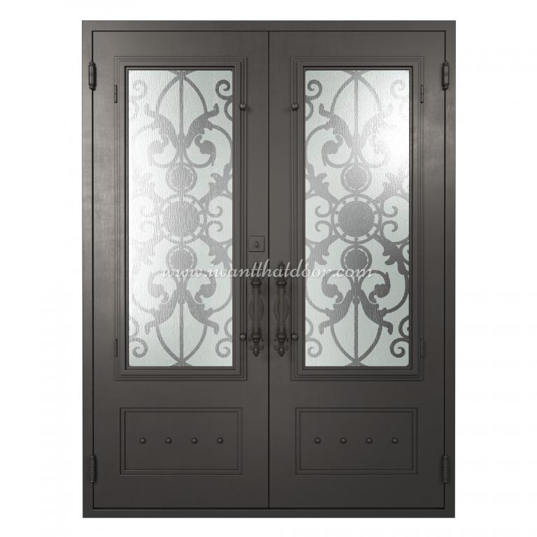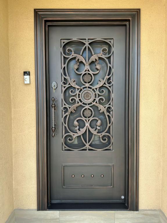 | CHANIA RH Wrought Iron Door 72 X 96 RIGHT HAND INSWING MEDIUM COPPER Color SANDBLAST Glass STEEL Material PULL HANDLE #020 SQUARE DEADBOLT DOUBLE SQUARE TOP Modern, Contemporary, Art Deco Style Residential, Commercial (Pull Handles and Locks are price separately) | |