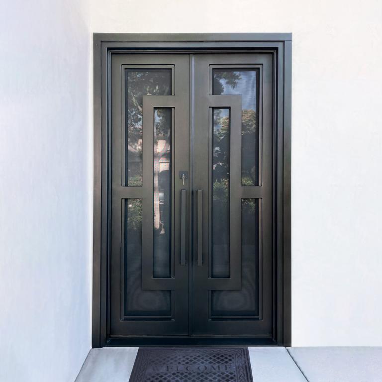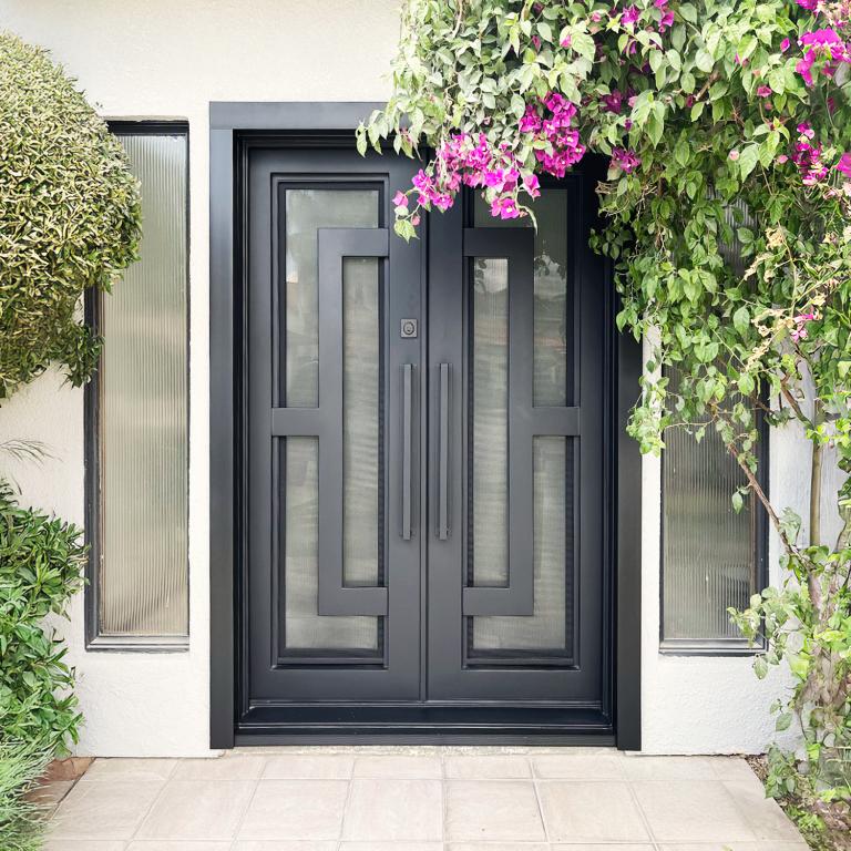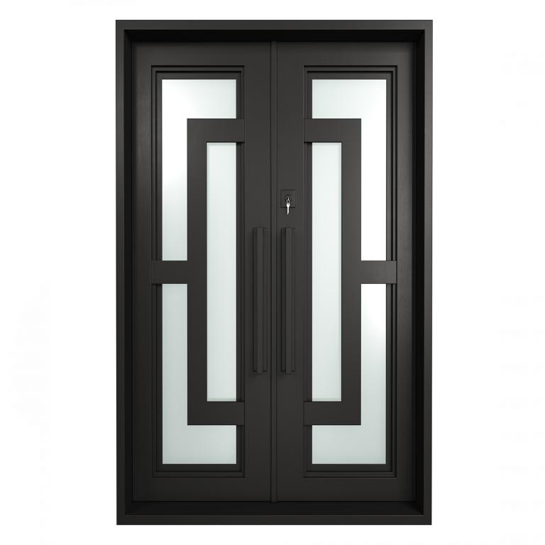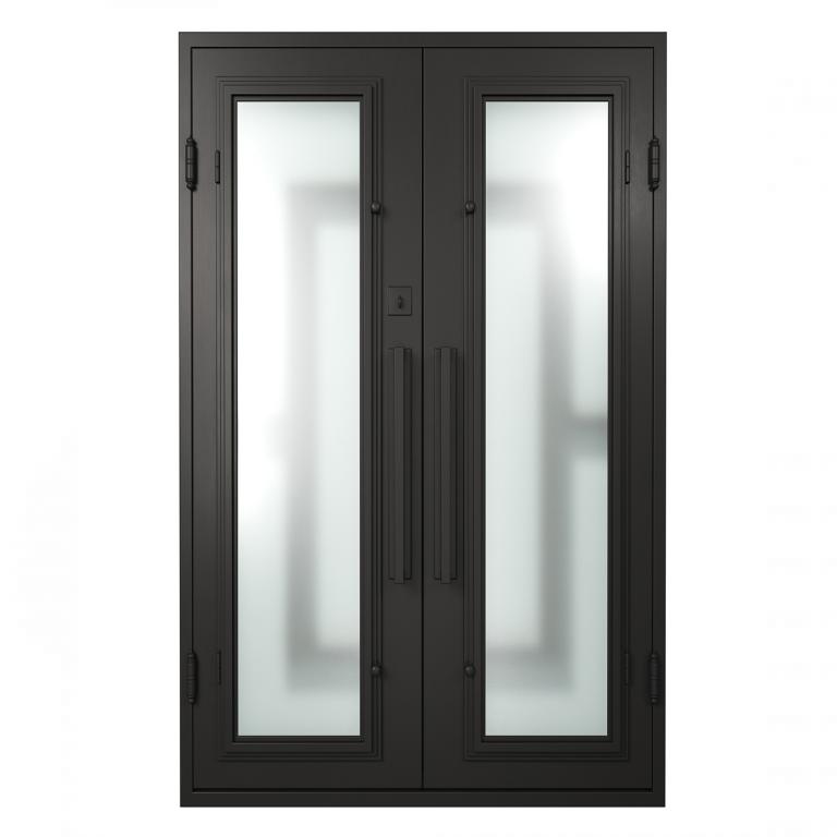 | OSLO RH Wrought Iron Door 61 X 96 RIGHT HAND INSWING FLAT BLACK Color SANDBLAST Glass STEEL Material PULL HANDLE #006 SQUARE DEADBOLT DOUBLE SQUARE TOP Modern Style Residential, Commercial (Pull Handles and Locks are price separately) | |