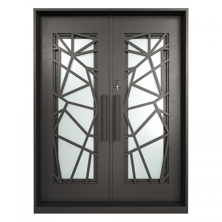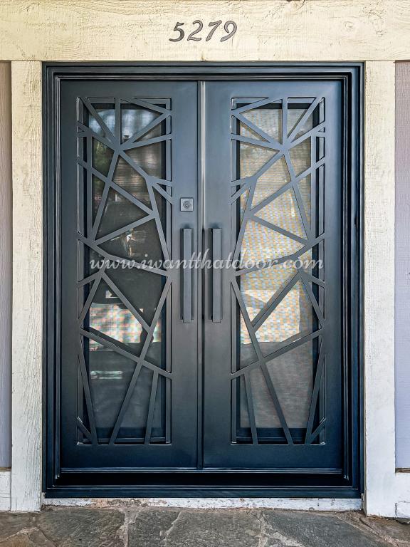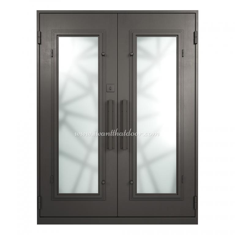 MOROCCO RH Wrought Iron Door 61 X 81 RIGHT HAND INSWING FLAT BLACK Color SANDBLAST Glass STEEL Material PULL HANDLE #006 SQUARE DEADBOLT DOUBLE SQUARE TOP Modern, Contemporary, Art Deco Style Residential, Commercial (Pull Handles and Locks are price separately)