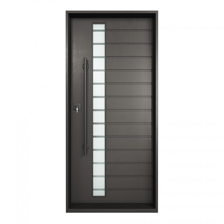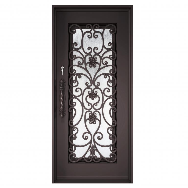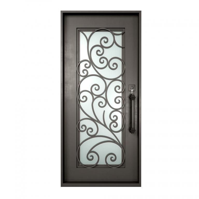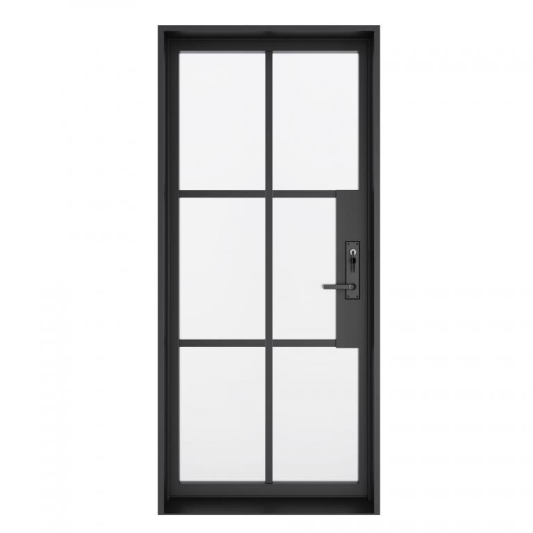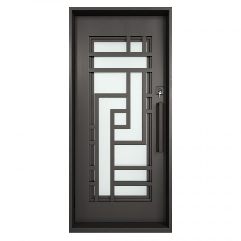 AKRON RH * WROUGHT IRON Style 37 X 81 RIGHT HAND INSWING FLAT BLACK Color SANDBLAST Glass STEEL Material PULL HANDLE #038 VITO - D107 - BL - S - SINGLE SQUARE TOP Modern, Contemporary, Art Deco Style clearance, solid, Residential, Commercial (Pull Handles and Locks are price separately)
