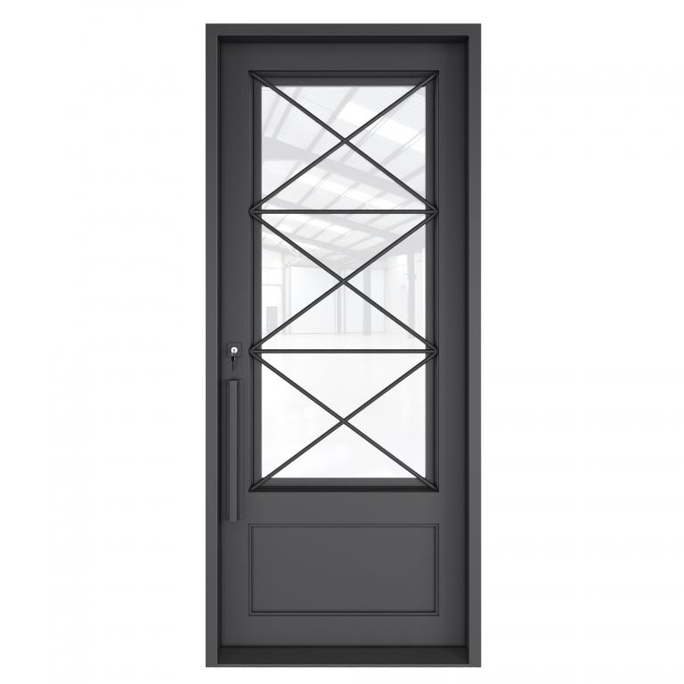 MOSCOW RH #R WROUGHT IRON Style 46 X 108 RIGHT HAND INSWING FLAT BLACK Color RAIN Glass STEEL Material PULL HANDLE #006 VITO - D107 - BL - S - SINGLE SQUARE TOP Modern, Contemporary Style special, clearance (Pull Handles and Locks are price separately)