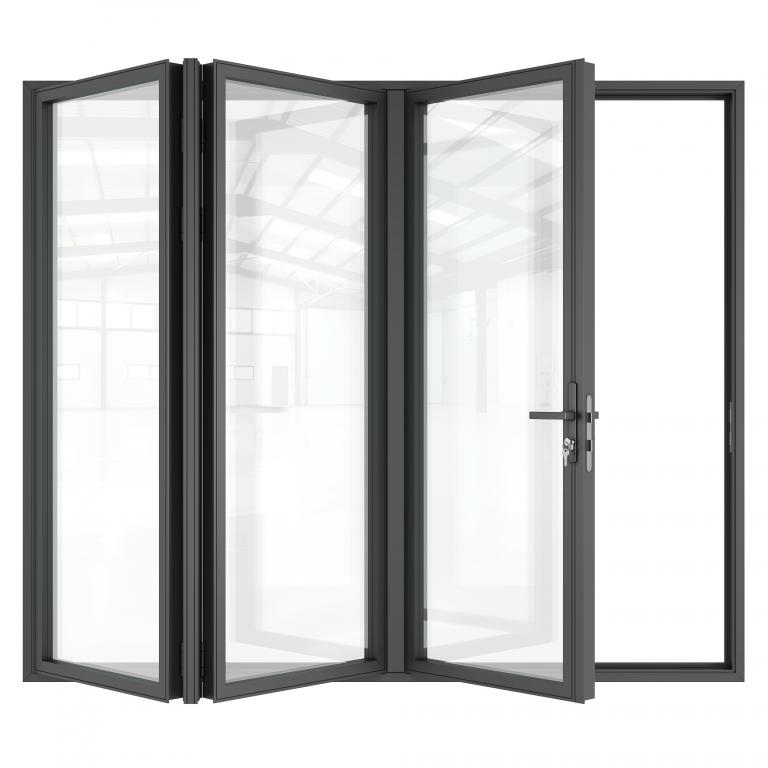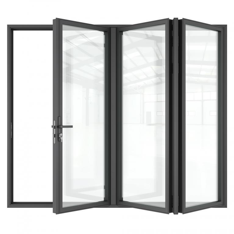 ALUMINUM BI-FOLD FR ALUMINIUM BI-FOLD Style 96 X 80 FOLD RIGHT FLAT BLACK Color LOW-E CLEAR Glass ALUMINUM Material CMECH DOUBLE SQUARE TOP Modern Style Thermal Break (Pull Handles and Locks are price separately)