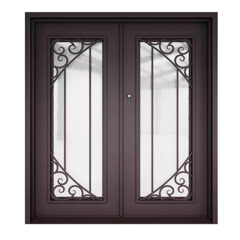 CUSTOM #1077 PK174 WROUGHT IRON Style 74 X 81 RIGHT HAND INSWING MEDIUM BRUSHED COPPER (05) Color RAIN + CLEAR Glass VITO - D107 - ORB -S - SQUARE TOP wScreen (Pull Handles and Locks are price separately)