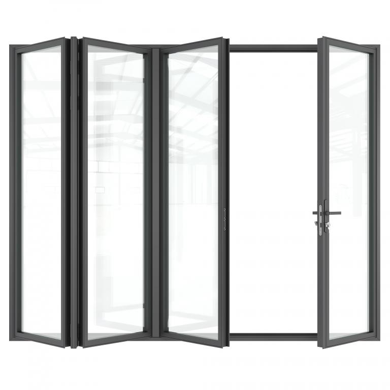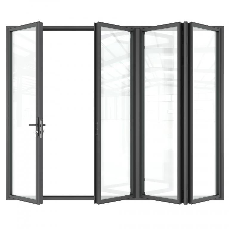 ALUMINUM BI-FOLD FR ALUMINIUM BI-FOLD Style 120 X 96 FOLD RIGHT FLAT BLACK Color LOW-E CLEAR Glass ALUMINUM Material CMECH DOUBLE SQUARE TOP Modern Style Thermal Break (Pull Handles and Locks are price separately)