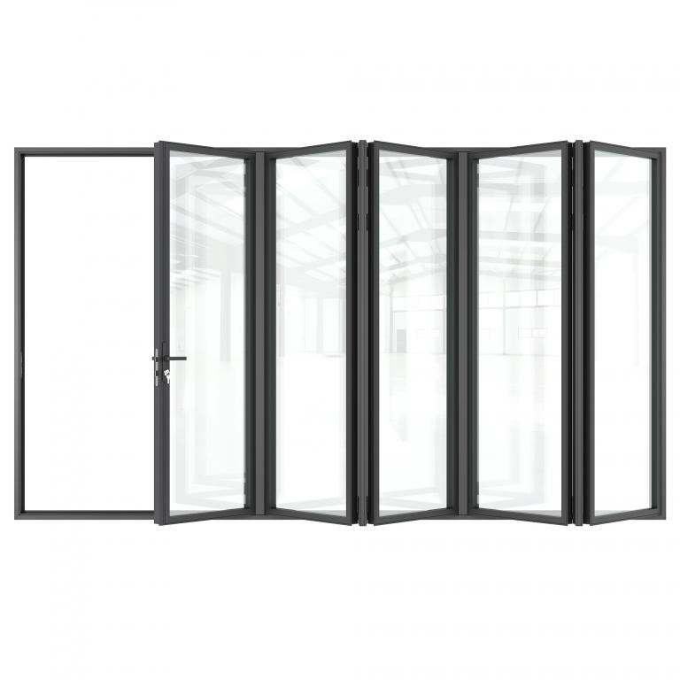 ALUMINUM BI-FOLD FR ALUMINIUM BI-FOLD Style 168 X 96 FOLD RIGHT FLAT BLACK Color LOW-E CLEAR Glass ALUMINUM Material CMECH DOUBLE SQUARE TOP Modern Style Thermal Break (Pull Handles and Locks are price separately)