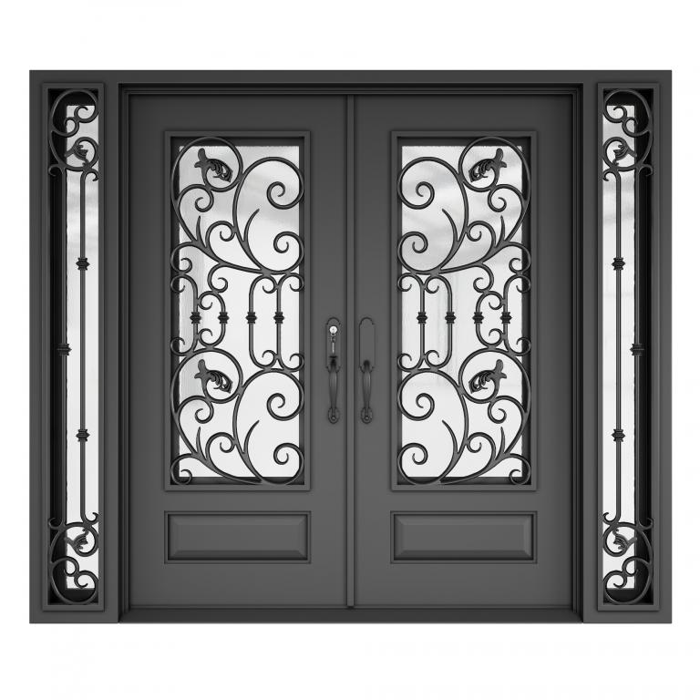 CUSTOM #1056 PK151 WROUGHT IRON Style 72 X 96 RIGHT HAND INSWING MATTE BLACK (01) Color SANDBLAST + CLEAR Glass SIROCCO - D109 - ORB - SINGLE CYLINDER SQUARE TOP Mediterranean, Spanish, Italianate Style wScreen (Pull Handles and Locks are price separately)