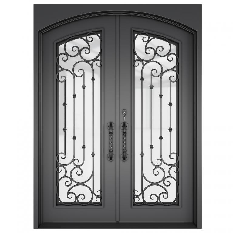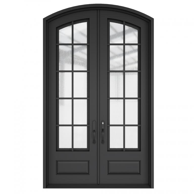CUSTOM #1050 PK144 WROUGHT IRON Style 84 X 216 RIGHT HAND INSWING MATTE BLACK (01) Color LOW-E CLEAR Glass SQUARE DEADBOLT EYEBROW TOP (Pull Handles and Locks are price separately)